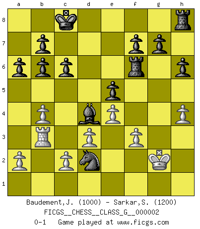 Last move : 0-1 2006 August 3 14:52:54 [Event "FICGS__CHESS__CLASS_G__000002"] [Site "FICGS"] [Date "2006.06.07"] [Round "1"] [White "Baudement,Julien"] [Black "Sarkar,Soumojit"] [Result "0-1"] [WhiteElo "1000"] [BlackElo "1200"] 1.e4 e5 2.Nf3 Nc6 3.Bb5 a6 4.Bxc6 dxc6 5.O-O Bg4 6.d3 Nf6 7.Re1 Bd6 8.h3 Bh5 9.Nbd2 Qd7 10.b3 O-O-O 11.Nc4 Bb4 12.Nb6+ cxb6 13.Bd2 Bxf3 14.Qxf3 Bxd2 15.Red1 Bc3 16.Rab1 Qd6 17.g4 h6 18.h4 Qd7 19.b4 Qxg4+ 20.Qxg4+ Nxg4 21.Rb3 Bd4 22.Rd2 Rd6 23.Kg2 Rf6 24.f3 Ne3+ 25.Kg3 Nf1+ 26.Kg2 Nxd2 0-1 Ruy Lopez : Exchange variation, 5.O-O Kingside Castling by player White (move 5) Queenside Castling by player Black (move 10) Player Black won this chess game. Follow this game move after move (download)A good player is always lucky. (Jose Raul Capablanca) Deine Wertungszahl - vorausgesetzt einige Jahre schachliche Anstrengung - entspricht etwa dem zehnfachen Deines IQ plus 1000. (Jonathan Levitt) Por tratar de evitar la pérdida de una pieza, muchas personas han perdido una partida de Ajedrez. (Savielly Tartakover) Il n'y a pas de prix trop élevé au scalp de l'ennemi. (Koblentz) Art is the only way to run away without leaving home. (Twyla Tharp)