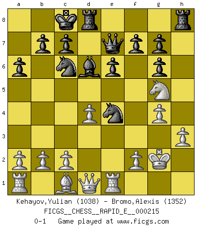 Last move : 0-1 2018 December 4 12:19:29 [Event "FICGS__CHESS__RAPID_E__000215"] [Site "FICGS"] [Date "2018.07.29"] [Round "1"] [White "Kehayov,Yulian"] [Black "Bromo,Alexis"] [Result "0-1"] [WhiteElo "1038"] [BlackElo "1352"] 1.d4 d5 2.e3 Nc6 3.Nf3 Nf6 4.Bd3 Bg4 5.O-O e6 6.h3 Bh5 7.g4 Bg6 8.Bxg6 hxg6 9.Kg2 Bd6 10.Nc3 a6 11.Re1 Qe7 12.Ng5 O-O-O 13.e4 dxe4 14.Ncxe4 Nxe4 0-1 This chess game has been lost on time (started : 2018.07.29 23:6:19) Queen's pawn game Kingside Castling by player White (move 5) Queenside Castling by player Black (move 12) Player Black won this chess game. Follow this game move after move (download)If you aren't afraid of Spassky, then I have removed the element of money. (Jim Slater) In der Schule lernt man nichts. Es ist nur Zeitverschwendung. (Robert James Fischer) En posiciones complicadas, Bobby Fischer pocas veces tuvo que temer de cualquiera. (Paul Keres) Les échecs sont utiles à l'exercice de la faculté de penser et à celle de l'imagination. Car nous devons posséder une méthode élaborée pour atteindre des buts partout où nous devons conduire notre raison. (Leibnitz) The various flowers seem good to different people. (Chinese proverb)