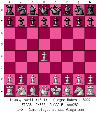 Last move : 1-0 2018 September 8 12:6:13 [Event "FICGS__CHESS__CLASS_B__000282"] [Site "FICGS"] [Date "2018.07.30"] [Round "1"] [White "Liwat,Lowell"] [Black "Alegre,Ruben"] [Result "1-0"] [WhiteElo "1841"] [BlackElo "1800"] 1.d4 1-0 This chess game has been lost on time (started : 2018.07.30 2:9:52) Queen's pawn Player White won this chess game. Follow this game move after move (download)Chess is as much a mystery as women. (Purdy) Der 70jährige Viktor Kortschnoi: Die Rentenanstalt wollte mich zwingen in Rente zu gehen. Meine Frau erhält jetzt eine Pension- und ich zahle weiter in die Rentenkasse ein! (Viktor Kortschnoi) No es suficiente ser un buen jugador, se debe también de jugar bién. (Siegbert Tarrasch) Pour moi, les échecs ne sont pas un jeu mais un art. (Alexandre Alekhine) Every vice is only an exaggeration of a necessary and virtuous function. (Ralph Waldo Emerson, Journals 1936)