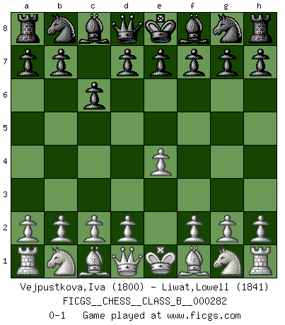 Last move : 0-1 2018 September 8 12:6:13 [Event "FICGS__CHESS__CLASS_B__000282"] [Site "FICGS"] [Date "2018.07.30"] [Round "1"] [White "Vejpustkova,Iva"] [Black "Liwat,Lowell"] [Result "0-1"] [WhiteElo "1800"] [BlackElo "1841"] 1.e4 c6 0-1 This chess game has been lost on time (started : 2018.07.30 2:9:52) Caro-Kann defense Player Black won this chess game. Follow this game move after move (download)The hallmark of the artist is simplicity. (Larry Evans) Ich verlor meine Bürgerrechte, mein Gehalt wurde mir nicht mehr bezahlt und ich wurde zensiert und durfte nicht mehr ins Ausland reisen. [nach dem Match Fischer-Taimanov 6:0] (Mark Taimanov) Evita las multitudes. Haz independientemente tu propio razonamiento. Trata de ser el jugador de Ajedrez, no la pieza de Ajedrez. (Ralph Charell) Le jeu d'échecs fait naître et fortifie en nous plusieurs qualités précieuses dans le cours de l'existence, telles que la prévoyance, la circonspection, la prudence, et la persévérance. (Benjamin Franklin - 1783, la morale des échecs) There is no instance of a country having benefited from prolonged warfare. (Sun Tzu)