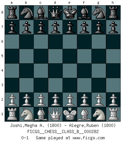 Last move : 0-1 2018 September 8 12:6:13 [Event "FICGS__CHESS__CLASS_B__000282"] [Site "FICGS"] [Date "2018.07.30"] [Round "1"] [White "Joshi,Megha A."] [Black "Alegre,Ruben"] [Result "0-1"] [WhiteElo "1800"] [BlackElo "1800"] 0-1 This chess game has been lost on time (started : 2018.07.30 2:9:52) Player Black won this chess game. Follow this game move after move (download)Chess is ruthless: you've got to be prepared to kill people. (Nigel Short) Wenn du nicht weißt was du tun sollst, warte bis dein Gegner eine Idee hat. Sie wird sicher schlecht sein. (Siegbert Tarrasch) Un buen sacrificio es aquel que aunque no sea necesariamente sólido, deja a tu oponente aturdido y confuso. (Rudolph Spielmann) Même si vous avez un bon coup à faire, regardez toujours s'il n'y en a pas un qui lui soit préférable. (Pedro Damiano) Question: Is 'This statement is paradoxical' a paradoxical statement ? Or is it a meta-paradox ? (Normajean Yates)