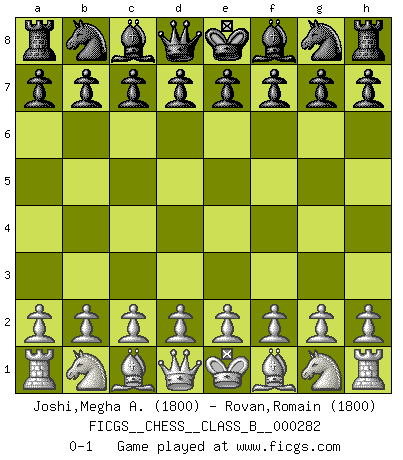 Last move : 0-1 2018 September 8 12:6:13 [Event "FICGS__CHESS__CLASS_B__000282"] [Site "FICGS"] [Date "2018.07.30"] [Round "1"] [White "Joshi,Megha A."] [Black "Rovan,Romain"] [Result "0-1"] [WhiteElo "1800"] [BlackElo "1800"] 0-1 This chess game has been lost on time (started : 2018.07.30 2:9:52) Player Black won this chess game. Follow this game move after move (download)I like to say that Bobby Fischer was the greatest player ever. But what made Fischer a genius was his ability to blend an American freshness and pragmatism with Russian ideas about strategy. (Bruce Pandolfini) Obwohl ich vom Stil her kaum zu den Priestern der Schachkunst gezählt werde, halte ich Schach doch für eine Kunst. (Tigran Petrosjan) El poder defensivo de una pieza clavada, solamente es imaginario. (Aaron Nimzovich) Le système Elo représente seulement une moyenne. Il est simplement un indicateur de votre stabilité. (Anatoli Karpov) Philosophers use a language that is already deformed as though by shoes that are too tight. (Ludwig Wittgenstein)