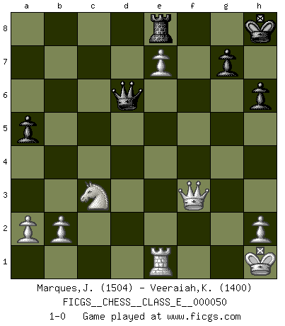 Last move : 1-0 2007 September 28 22:22:23 [Event "FICGS__CHESS__CLASS_E__000050"] [Site "FICGS"] [Date "2007.05.16"] [Round "1"] [White "Marques,Joao"] [Black "Veeraiah,Karuppaiah"] [Result "1-0"] [WhiteElo "1504"] [BlackElo "1400"] 1.e4 e5 2.Nf3 Nc6 3.Bc4 h6 4.O-O Nf6 5.d3 d5 6.exd5 Nd4 7.Nxe5 Qd6 8.c3 b5 9.cxd4 bxc4 10.Re1 Be7 11.Qa4+ Bd7 12.Qxc4 O-O 13.Nc3 Ng4 14.f3 Nxe5 15.dxe5 Qg6 16.e6 fxe6 17.dxe6 Be8 18.Kh1 a5 19.d4 Kh8 20.Qxc7 Qf6 21.d5 Bh5 22.Qe5 Qg6 23.Qc7 Qf6 24.d6 Bxf3 25.Be3 Bxg2+ 26.Kxg2 Qf3+ 27.Kg1 Bg5 28.Qb6 Rf6 29.Bxg5 Qg4+ 30.Kh1 Qxg5 31.Qg1 Qf5 32.e7 Qd7 33.Rad1 Rxd6 34.Rxd6 Qxd6 35.Qg2 Re8 36.Qf3 1-0 King's pawn game Kingside Castling by player White (move 4) Kingside Castling by player Black (move 12) Player White won this chess game. Follow this game move after move (download)It is not enough to be a good player... you must also play well. (Siegbert Tarrasch) Wenn Dein Gegner dir ein Remis anbietet, versuch herauszufinden, weshalb er glaubt schlechter zu stehen. (Nigel Short) Un mal día en el Ajedrez, es mejor que cualquier buen día en el trabajo. (Anonymous) Les échecs c'est le défi de l'alpiniste, toujours plus haut, prêt à tout pour monter à l'assaut du Roi ennemi. Les échecs, c'est de la musique en mouvement, un ballet majestueux pour les yeux. C'est de la poésie composée par les fantômes du passé qui au même titre que Rimbaud ou Verlaine méritent notre admiration. Les échecs, c'est de la peinture ou le moindre mouvement modifie le tableau pour en faire un Picasso ou un Van Gogh. Les échecs, c'est tout et rien, c'est la vie et la mort. Jjulie33 sur le forum de France-Echecs. Hello Thibault, if I have had a plan (and I had one, I hope), I have forgotten it during the last week... - Hello Heinz-Georg. What do you mean a plan ? (Anonymous players, during a Big Chess game)