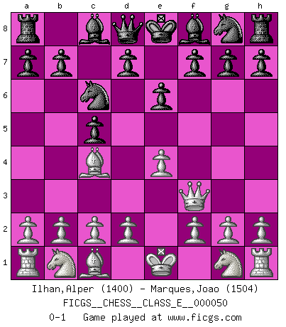 Last move : 0-1 2007 June 29 9:13:15 [Event "FICGS__CHESS__CLASS_E__000050"] [Site "FICGS"] [Date "2007.05.16"] [Round "1"] [White "Ilhan,Alper"] [Black "Marques,Joao"] [Result "0-1"] [WhiteElo "1400"] [BlackElo "1504"] 1.e4 c5 2.Bc4 e6 3.Qf3 Nc6 0-1 This chess game has been lost on time (started : 2007.05.16 13:52:3) Sicilian defense Player Black won this chess game. Follow this game move after move (download)When in doubt... play Chess ! (Tevis) Der Traum, für den ich lebe, ist der von einem freien Russland. Viele mögen sagen: Russland hat doch ein Parlament, einen gewählten Präsidenten. Aber ich spüre, dass in meiner Heimat die Angst wiederkehrt. Eine Angst, sich frei zu äußern, bestimmte Dinge zu tun (Garry Kasparov) Los Peones son el alma de una partida de Ajedrez. (Francois Andre Danican Philidor) C'est la seule position que je connaisse où les deux camps sont mals. Propos prêtés à V. Anand. Children in the dark cause accidents, accidents in the dark cause children. (Unknown)