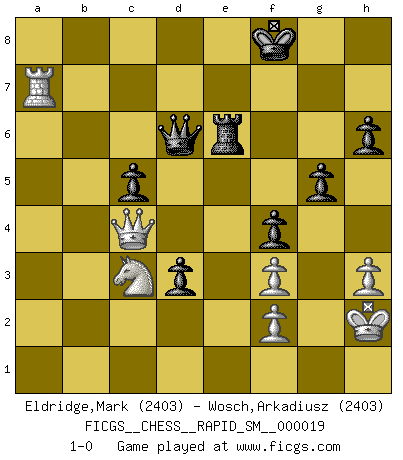Last move : 1-0 2018 October 21 21:59:44 [Event "FICGS__CHESS__RAPID_SM__000019"] [Site "FICGS"] [Date "2018.07.30"] [Round "1"] [White "Eldridge,Mark"] [Black "Wosch,Arkadiusz"] [Result "1-0"] [WhiteElo "2403"] [BlackElo "2403"] 1.d4 d5 2.c4 c6 3.Nf3 Nf6 4.Nc3 e6 5.Bg5 h6 6.Bh4 dxc4 7.e4 g5 8.Bg3 b5 9.Be2 Bb7 10.O-O Nbd7 11.Ne5 Bg7 12.Nxd7 Nxd7 13.Bd6 a6 14.a4 e5 15.Bg4 exd4 16.e5 c5 17.Re1 Nxe5 18.Bxe5 O-O 19.Bxg7 Kxg7 20.Ne2 f5 21.Bh5 f4 22.b3 Kh8 23.axb5 axb5 24.bxc4 bxc4 25.Qc2 Rxa1 26.Rxa1 Rf6 27.h3 Bd5 28.Qd1 Bb7 29.Ra7 Qb6 30.Qa1 Re6 31.Kh2 Kg8 32.Qa4 Kf8 33.Bf3 Bxf3 34.gxf3 Qd6 35.Qxc4 d3 36.Nc3 1-0 QGD Slav : 4.Nc3 Kingside Castling by player White (move 10) Kingside Castling by player Black (move 18) Player White won this chess game. Follow this game move after move (download)The isolated Pawn casts gloom over the entire chessboard. (Aaron Nimzovich) Ich weiss nicht was Gott gegen mich auf 1.e4 antworten würde. (Robert James Fischer) El Ajedrez es realmente noventa y nueve por ciento calculación. (Soltis) Si le désir cupide (et stupide) de gagner est une inépuisable source de souffrance, une combinaison brillante sur l'échiquier est une découverte : le coquelicot qui s'épanouit lorsque apparaît la Voie Lactée. (Arrabal) The faster the computer, the slower the brain. (Thibault de Vassal)