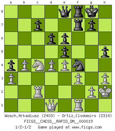Last move : 1/2-1/2 2018 September 22 15:50:40 [Event "FICGS__CHESS__RAPID_SM__000019"] [Site "FICGS"] [Date "2018.07.30"] [Round "1"] [White "Wosch,Arkadiusz"] [Black "Ortiz,Clodomiro"] [Result "1/2-1/2"] [WhiteElo "2403"] [BlackElo "2314"] 1.e4 e5 2.Nf3 Nc6 3.Bc4 Nf6 4.d3 Bc5 5.c3 d6 6.O-O O-O 7.Nbd2 a5 8.Re1 Be6 9.Bb5 Qb8 10.Qc2 Qa7 11.Nf1 a4 12.Bg5 Nd7 13.Be3 Qa5 14.Bxc6 bxc6 15.Ng5 Qb5 16.Nxe6 fxe6 17.Rab1 h6 18.h3 Bxe3 19.Nxe3 c5 20.Nc4 Nf6 21.b4 Nh5 22.a3 cxb4 23.cxb4 Rf7 24.Qd1 Nf4 25.Kh2 Raf8 26.Rb2 Ng6 27.f3 Nf4 28.Rc2 Qe8 29.Rf1 h5 30.d4 1/2-1/2 Two knights defense (Modern Bishop's Opening) Kingside Castling by player White (move 6) Kingside Castling by player Black (move 6) This chess game ended in a draw. Follow this game move after move (download)When you don't know what to do, wait for your opponent to get an idea - it's sure to be wrong. (Tarrasch) Es ist peinlich, dass ich nie Weltmeister wurde. Es wäre leicht, Leonid Breschnjew als Ursache vorzuschieben, dessen Apparat den Vorzeigekommunisten Anatoli Karpow in allem unterstützte. Aber Garri Kasparow zum Beispiel, der ebenfalls von den Sowjets unerwünscht war, hat trotz der Widerstände den WM-Titel erobert. (Viktor Kortschnoi) El Ajedrez es de 30 a 40 por ciento psicología. Uno no cuenta con esto cuando se juega contra una computadora. No lo puedo confundir. (Judith Polgar) Fischer est le meilleur joueur du monde et Karpov n'est qu'un joueur de bistrot. (Garry Kasparov, agé de 16 ans) Patience, use the Force, think ! (Obi-Wan Kenobi in Star Wars ep.2)