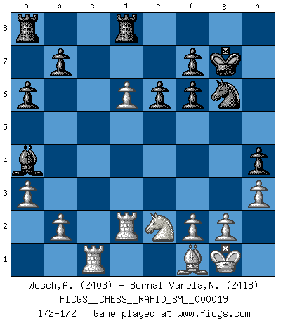 Last move : 1/2-1/2 2018 September 27 1:53:32 [Event "FICGS__CHESS__RAPID_SM__000019"] [Site "FICGS"] [Date "2018.07.30"] [Round "1"] [White "Wosch,Arkadiusz"] [Black "Bernal Varela,Nelson"] [Result "1/2-1/2"] [WhiteElo "2403"] [BlackElo "2418"] 1.e4 e6 2.d4 d5 3.Nc3 Nf6 4.Bg5 dxe4 5.Nxe4 Be7 6.Bxf6 gxf6 7.Nf3 Nd7 8.Bd3 c5 9.Qd2 Qc7 10.O-O h5 11.Rac1 Kf8 12.Rfe1 cxd4 13.Nxd4 Ne5 14.Rcd1 h4 15.Nb5 Qc6 16.h3 a6 17.Nd4 Qb6 18.Bf1 Ng6 19.c4 Kg7 20.Qc3 Qb4 21.Qc1 Rd8 22.a3 Qb6 23.c5 Qc7 24.Ne2 Bd7 25.Nd6 Ba4 26.Rd2 Bxd6 27.cxd6 Qxc1 28.Rxc1 1/2-1/2 French : Burn variation Kingside Castling by player White (move 10) This chess game ended in a draw. Follow this game move after move (download)A player surprised is half beaten. (Proverb) Ich bin stolz ein Bulgare zu sein. (Veselin Topalov) La señal de un Gran Maestro es su habilidad de ganar una partida rápidamente y sin dolor. (Irving Chernev) Roi des jeux et jeu des rois, les échecs portent en eux un sentiment d'infini. Ils donnent à celui qui s'est efforcé d'en approfondir les arcanes l'impression de n'être pas à la mesure de l'homme; en fait, ils constituent un résumé de l'univers, un microcosme, et figurent cette grande échelle qui, dans les plans de la lumière descend jusqu'à la matière, qui des abîmes insondables remonte jusqu'en l'infini de Dieu. (Pyrame) There are three kinds of lies: lies, damned lies and statistics. (Mark Twain)