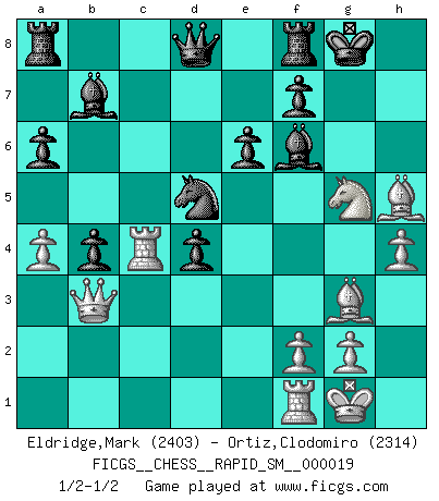 Last move : 1/2-1/2 2018 August 29 23:15:47 [Event "FICGS__CHESS__RAPID_SM__000019"] [Site "FICGS"] [Date "2018.07.30"] [Round "1"] [White "Eldridge,Mark"] [Black "Ortiz,Clodomiro"] [Result "1/2-1/2"] [WhiteElo "2403"] [BlackElo "2314"] 1.Nf3 d5 2.d4 Nf6 3.c4 e6 4.Nc3 c6 5.Bg5 h6 6.Bh4 dxc4 7.e4 g5 8.Bg3 b5 9.Be2 Bg7 10.e5 Nd5 11.a4 a6 12.Ne4 O-O 13.O-O Nd7 14.b3 cxb3 15.Qxb3 b4 16.Rac1 c5 17.h4 g4 18.Nh2 cxd4 19.Nxg4 Bb7 20.Rc4 h5 21.Ngf6+ N7xf6 22.exf6 Bxf6 23.Bxh5 Bg7 24.Ng5 Bf6 25.Ne4 Bg7 26.Ng5 Bf6 1/2-1/2 Reti Opening Kingside Castling by player Black (move 12) Kingside Castling by player White (move 13) This chess game ended in a draw. Follow this game move after move (download)Those who say they understand Chess, understand nothing. (Robert Hubner) Besser ein falscher Plan, logisch durchgeführt, als gar kein Plan. (Viktor Kortschnoi) Debemos de asegurarnos de que el Ajedrez no se convierta en un lenguaje muerto, muy interesante, pero tan solo para un grupo muy pequeño. (Sytze Faber) Avant la finale, les dieux ont créé le milieu de partie. (Tarrasch) A journey of a thousand sites begins with a single click. (Author unknown)