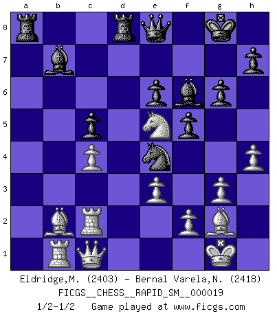 Last move : 1/2-1/2 2018 October 20 20:33:44 [Event "FICGS__CHESS__RAPID_SM__000019"] [Site "FICGS"] [Date "2018.07.30"] [Round "1"] [White "Eldridge,Mark"] [Black "Bernal Varela,Nelson"] [Result "1/2-1/2"] [WhiteElo "2403"] [BlackElo "2418"] 1.Nf3 e6 2.d4 f5 3.g3 Nf6 4.Bg2 Ne4 5.c4 Be7 6.O-O O-O 7.Qc2 d5 8.Nc3 c6 9.b3 Nd7 10.Bb2 b6 11.e3 Nxc3 12.Qxc3 Bb7 13.Rfc1 Nf6 14.Ne5 Ne4 15.Qe1 a5 16.Nd3 a4 17.Rab1 Bf6 18.Qe2 Re8 19.Qd1 axb3 20.axb3 Qe7 21.Rc2 Rec8 22.h4 Qe8 23.Nf4 Qf7 24.Nd3 Be7 25.Bf3 Rd8 26.Bh5 g6 27.Bf3 c5 28.Qc1 dxc4 29.Ne5 Qe8 30.bxc4 Bf6 31.dxc5 bxc5 32.Bg2 1/2-1/2 Reti Opening Kingside Castling by player White (move 6) Kingside Castling by player Black (move 6) This chess game ended in a draw. Follow this game move after move (download)There is only one thing Fischer does in Chess without pleasure: to lose ! (Boris Spassky) Im Internet Chess Club betrug mein Rating vorübergehend 3350 ELO-Punkte. (Sergej Karjakin) El Peón aislado arroja penumbra sobre todo el tablero. (Aaron Nimzovich) Lorsque vous vous retrouvez devant une position atroce, ne tendez pas un ultime piège dérisoire avec l'intention d'abandonner si l'adversaire le déjoue ! Faites-vous plutôt un devoir de résister comme si votre vie en dépendait. Jouez le coup qui vous déplairait au centuple si vous étiez dans la peau de votre tortionnaire ! If you work for a living, why do you kill yourself working ? (Tuco to a chicken in The Good, The Bad and The Ugly)