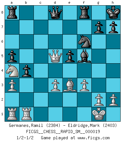 Last move : 1/2-1/2 2018 October 5 15:15:29 [Event "FICGS__CHESS__RAPID_SM__000019"] [Site "FICGS"] [Date "2018.07.30"] [Round "1"] [White "Germanes,Ramil"] [Black "Eldridge,Mark"] [Result "1/2-1/2"] [WhiteElo "2384"] [BlackElo "2403"] 1.e4 e5 2.Nf3 Nc6 3.Nc3 Nf6 4.Bb5 Nd4 5.Bc4 Bc5 6.d3 d6 7.Na4 b5 8.Nxd4 bxc4 9.Nf5 Bxf5 10.Nxc5 Bg6 11.Na4 O-O 12.O-O cxd3 13.cxd3 Nd7 14.Be3 f5 15.f3 c5 16.b4 cxb4 17.Qb3+ d5 18.exf5 Bxf5 19.Qxd5+ Kh8 20.a3 a5 21.Rfb1 Nf6 1/2-1/2 Four knights : Rubinstein counter-gambit Kingside Castling by player Black (move 11) Kingside Castling by player White (move 12) This chess game ended in a draw. Follow this game move after move (download)Why must I lose to this idiot ? (Aron Nimzovich) Wenn Capablanka heute auf der Schachbühne erscheinen würde, hätte er ein halbes Jahr gebraucht um sich die Schachtheorie anzueignen. Und dann hätte er alles und jeden besiegt. (Mikhail Moiseyevich Botvinik) Del Ajedrez se ha dicho que la vida no es lo suficientemente larga para él, pero eso es culpa de la vida, no del Ajedrez. (William Ewart Napier) Le système Elo représente seulement une moyenne. Il est simplement un indicateur de votre stabilité. (Anatoli Karpov) Perhaps chess is the wrong game for the times (The Chess Master and the Computer, by Garry Kasparov - 2010)