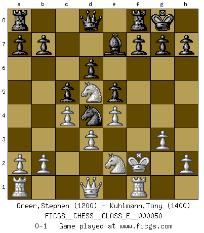 Last move : 0-1 2007 August 1 19:47:10 [Event "FICGS__CHESS__CLASS_E__000050"] [Site "FICGS"] [Date "2007.05.16"] [Round "1"] [White "Greer,Stephen"] [Black "Kuhlmann,Tony"] [Result "0-1"] [WhiteElo "1200"] [BlackElo "1400"] 1.e4 c5 2.c4 Nc6 3.Nc3 e5 4.g3 Nf6 5.Bg2 d6 6.d3 Be7 7.Bg5 Nd4 8.Bxf6 Bxf6 9.Nge2 Bg4 10.f3 Bxf3 11.Bxf3 Nxf3+ 12.Kf2 Nd4 13.Nd5 O-O 14.Rf1 Be7 0-1 Sicilian defense Kingside Castling by player Black (move 13) Player Black won this chess game. Follow this game move after move (download)There is no remorse like the remorse of Chess. (H. G. Wells) Ich verstehe Aljechins Kombinationen ganz gut; aber woher er diese Angriffschancen bekommt und wie er die Eröffnung behandelt das ist für mich ein Buch mit sieben Siegeln. (Rudolf Spielmann) El jugador blanco perdió porque fallo en recordar la coreccta continuación y tuvo que pensar por sí mismo las movidas. (Siegbert Tarrasch) Pour moi, les échecs ne sont pas un jeu mais un art. (Alexandre Alekhine) You think that education is too expensive ? Try ignorance. (Derek Bok)