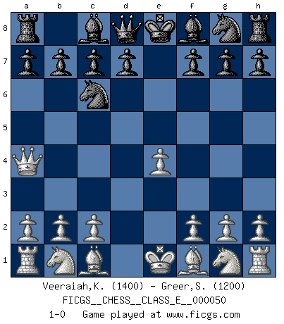 Last move : 1-0 2007 July 1 21:27:43 [Event "FICGS__CHESS__CLASS_E__000050"] [Site "FICGS"] [Date "2007.05.16"] [Round "1"] [White "Veeraiah,Karuppaiah"] [Black "Greer,Stephen"] [Result "1-0"] [WhiteElo "1400"] [BlackElo "1200"] 1.e4 e5 2.d4 exd4 3.Qxd4 Nc6 4.Qa4 1-0 This chess game has been lost on time (started : 2007.05.16 13:52:3) Centre game Player White won this chess game. Follow this game move after move (download)No one ever won a game by resigning. (Unknown) Ich bin Weltmeister und muß mit niemandem irgend etwas diskutieren. (Viswanathan Anand) No es tiempo de jugar al Ajedrez cuando la casa esta en llamas. (Proverbio Italiano) Les Echecs, c'est l'art de la guerre sans les charniers, c'est la résurrection des morts tombés au champ d'honneur, l'espoir perpétuel, la suprématie de l'intelligence sur la force, la culture de l'esprit. (F. Szpiner) There's no money in correspondence chess. (John Knudsen)