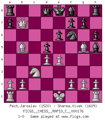 Last move : 1-0 2018 September 12 5:11:16 [Event "FICGS__CHESS__RAPID_C__000176"] [Site "FICGS"] [Date "2018.07.31"] [Round "1"] [White "Pech,Jaroslav"] [Black "Sharma,Vivek"] [Result "1-0"] [WhiteElo "1520"] [BlackElo "1609"] 1.d4 d5 2.c4 c6 3.Nf3 Nf6 4.Nc3 Bg4 5.Ne5 e6 6.cxd5 cxd5 7.Bg5 Bh5 8.Qa4+ Nc6 9.Nxc6 bxc6 10.Qxc6+ Ke7 11.e4 h6 12.Qb7+ Ke8 13.Bb5+ 1-0 QGD Slav : 4.Nc3 Player White won this chess game. Follow this game move after move (download)You cannot play at Chess if you are kind-hearted. (French Proverb) Ein Springer auf f6 gegen die eigene Rochadestellung ist schlimmer als ein rostiger Nagel im Knie. (Efim Bogoljubov) El Ajedrez es una guerra en un tablero. El objetivo es aplastar la mente del oponente. (Bobby Fischer) Il s'avisa de me proposer d'apprendre les échecs qu'il jouait un peu... me voilà forcené des échecs. J'achète un échiquier, je m'enferme dans ma chambre, j'y passe des jours et des nuits à vouloir apprendre par cœur toutes les parties. (Jean-Jacques Rousseau, Confessions) Empty your mind, be formless, shapeless — like water. (Bruce Lee)