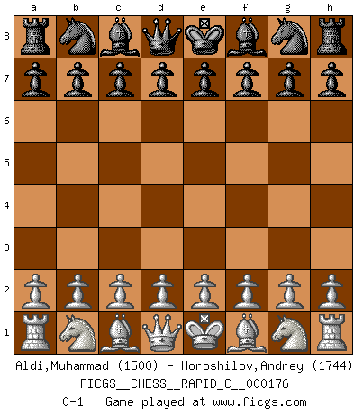 Last move : 0-1 2018 August 30 11:19:45 [Event "FICGS__CHESS__RAPID_C__000176"] [Site "FICGS"] [Date "2018.07.31"] [Round "1"] [White "Aldi,Muhammad"] [Black "Horoshilov,Andrey"] [Result "0-1"] [WhiteElo "1500"] [BlackElo "1744"] 0-1 This chess game has been lost on time (started : 2018.07.31 2:48:3) Player Black won this chess game. Follow this game move after move (download)Do you realize Fischer almost never has any bad pieces? He exchanges them, and the bad pieces remain with his opponents. (Yuri Balashov) Ich erzeugte keinen Neid, da mich die Schachspieler als Musiker und die Musiker als Schachspieler betrachteten. (Mark Taimanov) Nunca antes ha habido un jugador de Ajedrez con tal conocimiento a fondo de las complejidades del juego y una inmensa voluntad absolutamente indomable de ganar. Yo pienso que Fischer es el jugador mas grande que jamás haya existido. (Lisa Lane) Même un GMI sait rarement calculer sur plus de cinq coups une attaque à sacrifices. (Rudolf Spielmann) I feel so... helpless. (C-3PO in Star Wars ep.3)