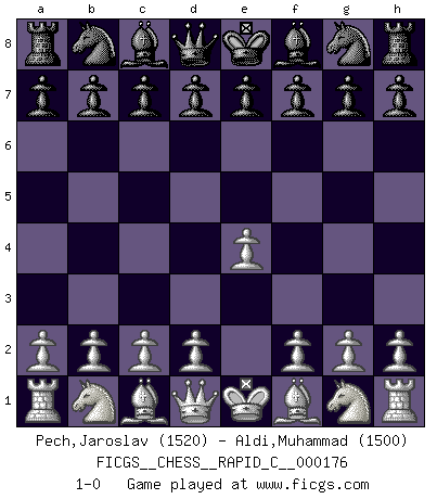 Last move : 1-0 2018 August 30 11:19:45 [Event "FICGS__CHESS__RAPID_C__000176"] [Site "FICGS"] [Date "2018.07.31"] [Round "1"] [White "Pech,Jaroslav"] [Black "Aldi,Muhammad"] [Result "1-0"] [WhiteElo "1520"] [BlackElo "1500"] 1.e4 1-0 This chess game has been lost on time (started : 2018.07.31 2:48:3) King's pawn Opening Player White won this chess game. Follow this game move after move (download)A bad plan is better than none at all. (Frank Marshall) Wenn Du einsam bist, wenn Du Dich in der Welt wie ein Fremder fühlst, spiele Schach. Das wird Deinen Geist erheben und Dein Ratgeber im Kampf sein. (Aristoteles) Siempre es mucho mejor sacrificar las piezas de tu oponente. (Savielly Tartakover) Les échecs sont plus proches de l'art de l'assassinat que de l'art de la guerre. (Arturo Perez-Reverte) For to win one hundred victories in one hundred battles is not the acme of skill. To subdue the enemy without fighting is the acme of skill. (Sun Tzu)