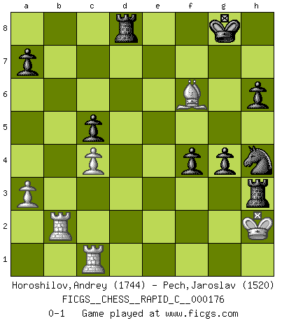 Last move : 0-1 2018 November 11 6:3:18 [Event "FICGS__CHESS__RAPID_C__000176"] [Site "FICGS"] [Date "2018.07.31"] [Round "1"] [White "Horoshilov,Andrey"] [Black "Pech,Jaroslav"] [Result "0-1"] [WhiteElo "1744"] [BlackElo "1520"] 1.e4 c5 2.Nf3 Nc6 3.Nc3 e5 4.Bc4 Be7 5.O-O d6 6.d3 Nf6 7.Nd5 O-O 8.Nxe7+ Qxe7 9.Bg5 h6 10.Bd2 Be6 11.Bxe6 Qxe6 12.h3 d5 13.exd5 Nxd5 14.Re1 f6 15.c4 Nc7 16.Bc3 Rad8 17.Qc2 Qf5 18.Rad1 Ne6 19.Nh4 Qh5 20.Nf3 Nf4 21.Re4 Nxh3+ 22.gxh3 Qxf3 23.Re3 Qh5 24.Qe2 Qxe2 25.Rxe2 Rd7 26.a3 Rfd8 27.Red2 b6 28.Kf1 Ne7 29.b4 Ng6 30.bxc5 bxc5 31.h4 Nxh4 32.f4 Nf3 33.Rf2 Rxd3 34.Rc1 exf4 35.Kg2 Nh4+ 36.Kh2 g5 37.Rb2 g4 38.Bxf6 Rh3+ 0-1 Sicilian defense Kingside Castling by player White (move 5) Kingside Castling by player Black (move 7) Player Black won this chess game. Follow this game move after move (download)Bobby Fischer is the greatest Chess genius of all time ! (Alexander Kotov) Schach ist ein schwarz-weisser Dschungel. (Garry Kasparov) El Ajedrez es sobre todo, ¡una pelea!. (Emanuel Lasker) Soyez une menace à chaque fois que vous vous asseyez pour jouer. (Ken Smith) Chess, like love, like music, has the power to make people happy. (Siegbert Tarrasch)