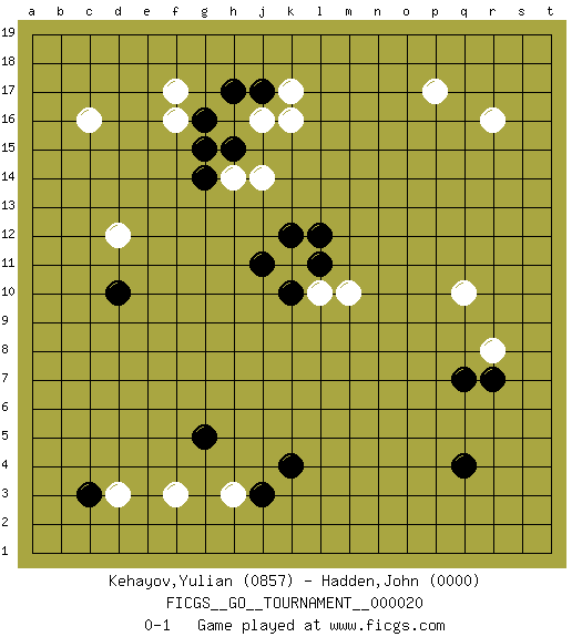 Last move : 0-1 2018 September 24 15:26:45 [Event "FICGS__GO__TOURNAMENT__000020"] [Site "FICGS"] [Date "2018.08.01"] [Round "1"] [Black "Kehayov,Yulian"] [White "Hadden,John"] [Result "0-1"] [Rating 1 "0857"] [Rating 2 "0000"] 1.c3 r16 2.q4 p17 3.k4 c16 4.d10 q10 5.k10 k16 6.r7 r8 7.q7 m10 8.j17 k17 9.h17 f17 10.g16 f16 11.g15 d12 12.l12 k11 13.l11 l10 14.j11 h14 15.h15 j16 16.g14 j14 17.k12 f3 18.g5 h3 19.j3 d3 0-1 This go game has been lost on time (started : 2018.08.01 1:56:6) Here are the names of the openings (joseki) played in the four corners : Corner d16 : c16 j17 Komoku (Somok, Xiao~mu`) 3-4 Point. The komoku (3-4) point is the traditional corner enclosure move.. Corner d4 : c3 f3 San-San (Sam-Sam, San-San) 3-3 Point. The San-San (3-3) point, emphasizing territory at the expense of influence. Niken Kakari (Dukan Keolch'im, E`r Gua`jiao~, 2-Space Low Approach). Black can thwart White's strategy with a play at 9-4. Player White won this Go (weiqi, baduk) game. Follow this game move after move (download)Josekis are not fixed, definitive things. They indicate the moments when everything can change. (Pierre Audouard) Have no fear of perfection - you'll never reach it. (Salvador Dali)