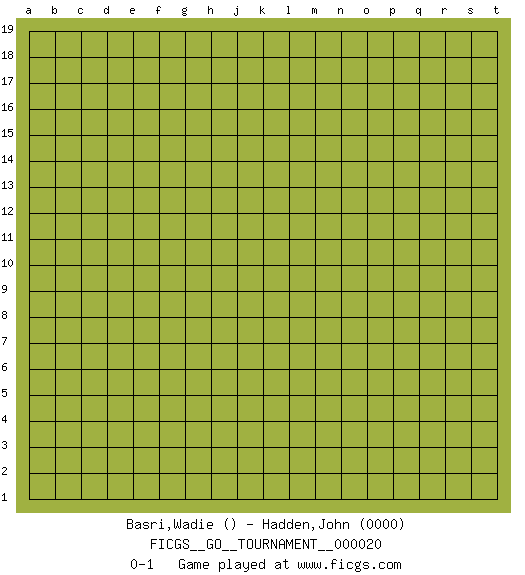 Last move : 0-1 2018 August 31 11:20:29 [Event "FICGS__GO__TOURNAMENT__000020"] [Site "FICGS"] [Date "2018.08.01"] [Round "1"] [Black "Basri,Wadie"] [White "Hadden,John"] [Result "0-1"] [Rating 2 "0000"] 0-1 This go game has been lost on time (started : 2018.08.01 1:56:6) Here are the names of the openings (joseki) played in the four corners : Player White won this Go (weiqi, baduk) game. Follow this game move after move (download)Don't disturb symmetry. (Anonymous) If I had no sense of humor, I would long ago have committed suicide. (Mahatma Gandhi)