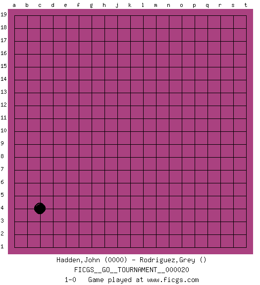 Last move : 1-0 2018 September 3 23:38:34 [Event "FICGS__GO__TOURNAMENT__000020"] [Site "FICGS"] [Date "2018.08.01"] [Round "1"] [Black "Hadden,John"] [White "Rodriguez,Grey"] [Result "1-0"] [Rating 1 "0000"] 1.c4 1-0 This go game has been lost on time (started : 2018.08.01 1:56:6) Here are the names of the openings (joseki) played in the four corners : Corner d4 : c4 1-0 Komoku (Somok, Xiao~mu`) 3-4 Point. The komoku (3-4) point is the traditional corner enclosure move.. Player Black won this Go (weiqi, baduk) game. Follow this game move after move (download)Proverbs do not apply to White. (Tero Sand) Just because you do not take an interest in politics doesn't mean politics won't take an interest in you. (Pericles 430 B.C.)