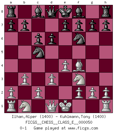 Last move : 0-1 2007 June 26 14:57:44 [Event "FICGS__CHESS__CLASS_E__000050"] [Site "FICGS"] [Date "2007.05.16"] [Round "1"] [White "Ilhan,Alper"] [Black "Kuhlmann,Tony"] [Result "0-1"] [WhiteElo "1400"] [BlackElo "1400"] 1.e4 d6 2.Bb5+ c6 3.Ba4 Nf6 4.d3 Na6 5.Bf4 Nc5 6.Nf3 Nxa4 7.b3 Nc5 0-1 This chess game has been lost on time (started : 2007.05.16 13:52:3) King's pawn Opening Player Black won this chess game. Follow this game move after move (download)When in doubt... play Chess ! (Tevis) Jeder weiß, dass Gasprom Putins persönliches Machtinstrument ist. Die Firma wird vom Kreml aus geleitet und wird schon deshalb nie transparent sein. (Garry Kasparov) El Ajedrez es un mar en el cual un mosquito puede beber y un elefante puede bañarse. (Refrán Hindú) Je menace de comprendre la position. (Anonyme) There is no instance of a country having benefited from prolonged warfare. (Sun Tzu)