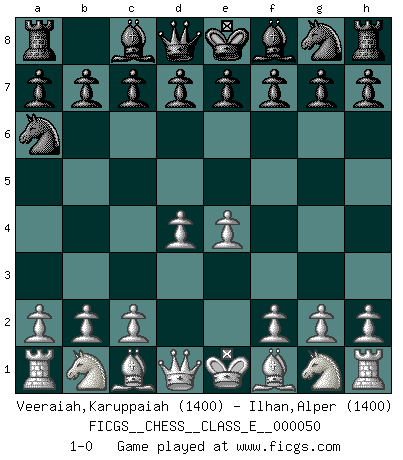 Last move : 1-0 2007 June 30 21:24:43 [Event "FICGS__CHESS__CLASS_E__000050"] [Site "FICGS"] [Date "2007.05.16"] [Round "1"] [White "Veeraiah,Karuppaiah"] [Black "Ilhan,Alper"] [Result "1-0"] [WhiteElo "1400"] [BlackElo "1400"] 1.e4 Na6 2.d4 1-0 This chess game has been lost on time (started : 2007.05.16 13:52:3) Lemming defense Player White won this chess game. Follow this game move after move (download)Chess is a terrible game. If you have no center, your opponent has a freer position. If you do have a center, then you really have something to worry about ! (Siegbert Tarrasch) Der vorletzte Fehler gewinnt. (Savielly Grigorievitsch Tartakower) En la perfecta combinación de Ajedrez como en una historia corta de primera clase, toda la trama y contra trama deberá conducir hacia un final sorprendente, el interes no es mitigado hasta el último momento. (Yates and Winter) Le joueur d'Echecs qui veut atteindre le top est obligé de développer son propre credo créatif. Alexeï Stepanovicth Souétine. Il est facile d'écrire des livres ! Ce qui est difficile, c'est de jouer ! (Alexeï Stepanovicth Souétine) The meaning of life is that it is to be lived, and it is not to be traded and conceptualized and squeezed into a pattern of systems. (Bruce Lee)