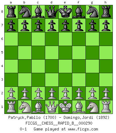 Last move : 0-1 2018 September 1 11:24:17 [Event "FICGS__CHESS__RAPID_B__000290"] [Site "FICGS"] [Date "2018.08.02"] [Round "1"] [White "Patryck,Pabllo"] [Black "Domingo,Jordi"] [Result "0-1"] [WhiteElo "1700"] [BlackElo "1892"] 0-1 This chess game has been lost on time (started : 2018.08.02 0:0:33) Player Black won this chess game. Follow this game move after move (download)It was clear to me that the vulnerable point of the American Grandmaster (Bobby Fischer) was in double-edged, hanging, irrational positions, where he often failed to find a win even in a won position. (Efim Geller) Es ist wirklich schade, dass so viele Schachspieler nicht auf ihr Äußeres achten! (Alexandra Kosteniuk) ¿Quién es tu oponente esta tarde? Esta tarde mi oponente son las piezas negras. (Akiba Rubinstein) D'abord les bases : Jouez et étudiez, puis étudiez et jouez, ensuite jouez et étudiez, puis étudiez et jouez. Deuxièmement : Donnez toujours le meilleur de vous-même ! (Ken Smith) The problem with troubleshooting is that trouble shoots back. (Anonymous)