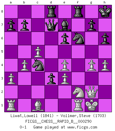 Last move : 0-1 2018 August 4 17:1:49 [Event "FICGS__CHESS__RAPID_B__000290"] [Site "FICGS"] [Date "2018.08.02"] [Round "1"] [White "Liwat,Lowell"] [Black "Vollmer,Steve"] [Result "0-1"] [WhiteElo "1841"] [BlackElo "1703"] 1.d4 d5 2.c4 e6 3.f3 Nf6 4.a3 c5 5.e3 Nc6 6.Nc3 Bd6 7.dxc5 Bxc5 8.b4 Bd6 9.c5 Be7 10.Bd3 O-O 11.h4 e5 12.g3 Be6 13.Nh3 Qd7 14.Ng5 Rad8 15.Qc2 h6 16.Bh7+ Kh8 17.Nxe6 fxe6 18.Bg6 d4 19.Nd1 d3 20.Qg2 e4 21.O-O Ne5 22.fxe4 Nxg6 23.Nf2 Ne5 24.g4 Nc4 0-1 Queen's gambit declined Kingside Castling by player Black (move 10) Kingside Castling by player White (move 21) Player Black won this chess game. Follow this game move after move (download)The Chess pieces are the block alphabet which shapes thoughts; and these thoughts, although making a visual design on the chessboard, express their beauty abstractly, like a poem. (Marcel Duchamp) Privat ist Kortschnoi kein schlechter Mensch, sehr sympathisch. Aber während des Spiels ist er grausam. Er will dich töten. (Miguel Najdorf) Si tu oponente no puede hacer nada activo, entonces no apures la posición; En vez de eso, dejalo estar sentado ahí, sufriendo y rogandote por un empate. (Jeremy Silman) Les échecs, c'est la lutte contre l'erreur. (Johannes Zukertort) Every now and then a man's mind is stretched by a new idea and never shrinks back to its former dimensions. (Oliver Wendell Holmes, Sr.)