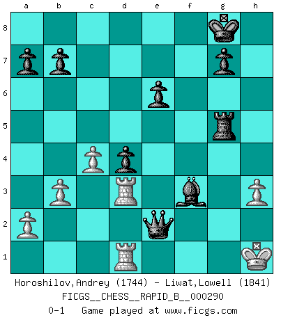 Last move : 0-1 2018 August 5 14:3:16 [Event "FICGS__CHESS__RAPID_B__000290"] [Site "FICGS"] [Date "2018.08.02"] [Round "1"] [White "Horoshilov,Andrey"] [Black "Liwat,Lowell"] [Result "0-1"] [WhiteElo "1744"] [BlackElo "1841"] 1.e4 c6 2.d4 Nf6 3.Nc3 d6 4.Be2 h5 5.h3 e6 6.Bg5 Be7 7.Bxf6 Bxf6 8.Bxh5 c5 9.dxc5 Qa5 10.Bxf7+ Kxf7 11.Nge2 dxc5 12.O-O Nc6 13.f4 Nd4 14.e5 Be7 15.Nxd4 cxd4 16.Ne4 Qd5 17.Ng5+ Kg8 18.Qg4 Bd7 19.Rad1 Rf8 20.b3 Rf5 21.c4 Qc5 22.Kh2 Bxg5 23.fxg5 Qxe5+ 24.Kh1 Rxg5 25.Qf3 Rxh3+ 26.gxh3 Bc6 27.Rd3 Qe2 28.Rfd1 Bxf3+ 0-1 Caro-Masi defense Kingside Castling by player White (move 12) Player Black won this chess game. Follow this game move after move (download)There is no remorse like the remorse of Chess. (H. G. Wells) Du kannst im Schach nur gut werden, wenn du das Spiel liebst. (Robert James Fischer) El ganar no lo es todo... pero el perder es nada. (Mednis) Il n'y a pas de prix trop élevé au scalp de l'ennemi. (Koblentz) Don't be discouraged. It's often the last key in the bunch that opens the lock. (Author unknown)