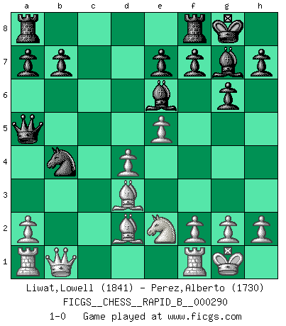 Last move : 1-0 2018 August 17 20:27:40 [Event "FICGS__CHESS__RAPID_B__000290"] [Site "FICGS"] [Date "2018.08.02"] [Round "1"] [White "Liwat,Lowell"] [Black "Perez,Alberto"] [Result "1-0"] [WhiteElo "1841"] [BlackElo "1730"] 1.d4 Nf6 2.c4 g6 3.Nc3 d5 4.cxd5 Nxd5 5.e4 Nxc3 6.bxc3 Bg7 7.Be3 O-O 8.Bd3 c5 9.Ne2 Nc6 10.e5 Be6 11.O-O Qa5 12.Qb1 cxd4 13.cxd4 Nb4 14.Bd2 1-0 King's Indian defense, 3.Nc3 Kingside Castling by player Black (move 7) Kingside Castling by player White (move 11) Player White won this chess game. Follow this game move after move (download)No one ever won a game by resigning. (Unknown) Wenn man heute mit 14 Jahren noch kein GM ist, kann man es vergessen. (Viswanathan Anand) Cuando no sepas que mover, espera por una idea que se le venga a la la cabeza de tu oponente. Tenlo por seguro de que esa idea estará incorrecta. (Siegbert Tarrasch) Ce qui caractérise les parties de combat, c'est que si le défenseur a constamment de difficiles problèmes à résoudre, l'attaquant doit chercher sans relâche de nouvelles possibilités d'attaque. (Koblentz) Industry executives and analysts often mistakenly talk about strategy as if it were some kind of chess match. But in chess, you have just two opponents, each with identical resources, and with luck playing a minimal role. The real world is much more like a poker game, with multiple players trying to make the best of whatever hand fortune has dealt them. In our industry, Bill Gates owns the table until someone proves otherwise. (David Moschella, 'Computerworld')