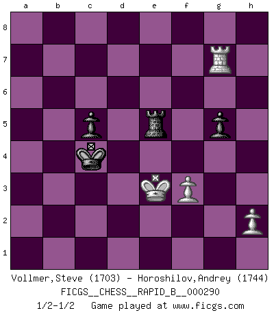 Last move : 1/2-1/2 2018 September 3 17:24:22 [Event "FICGS__CHESS__RAPID_B__000290"] [Site "FICGS"] [Date "2018.08.02"] [Round "1"] [White "Vollmer,Steve"] [Black "Horoshilov,Andrey"] [Result "1/2-1/2"] [WhiteElo "1703"] [BlackElo "1744"] 1.d4 Nf6 2.c4 g6 3.Nc3 Bg7 4.e4 d6 5.f4 Bg4 6.Be2 Bxe2 7.Ngxe2 O-O 8.O-O Na6 9.f5 Nd7 10.Bf4 e5 11.fxe6 fxe6 12.Qd2 c5 13.d5 Ne5 14.Bxe5 Bxe5 15.Rxf8+ Qxf8 16.Rf1 Qe7 17.a3 Nc7 18.b4 b6 19.bxc5 dxc5 20.Rd1 Rd8 21.a4 Qd6 22.Qh6 Bg7 23.Qh3 Bxc3 24.Nxc3 exd5 25.exd5 Qf6 26.Qf3 Qxf3 27.gxf3 Ne8 28.Ne4 Kg7 29.a5 Nd6 30.Nxd6 Rxd6 31.Rb1 bxa5 32.Rb7+ Kf6 33.Rxa7 Ke5 34.Rxa5 Kd4 35.Ra4 Kc3 36.Kf2 Kb3 37.Ra7 Kxc4 38.Rxh7 Rxd5 39.Rg7 g5 40.Ke3 Re5+ 41.Kd2 Rd5+ 42.Ke3 Re5+ 43.Kd2 Rd5+ 44.Ke3 Re5+ 1/2-1/2 King's Indian : Four pawns attack Kingside Castling by player Black (move 7) Kingside Castling by player White (move 8) 10 pieces endgame at move 37 : White KRPPP , Black KRPPP WHITE : King + 1 Rook 3 Pawns BLACK : King + 1 Rook 3 Pawns 9 pieces endgame at move 38 : White KRPPP , Black KRPP WHITE : King + 1 Rook 3 Pawns BLACK : King + 1 Rook 2 Pawns 8 pieces endgame at move 38 : White KRPP , Black KRPP WHITE : King + 1 Rook 2 Pawns BLACK : King + 1 Rook 2 Pawns This chess game ended in a draw. Follow this game move after move (download)Is Bobby Fischer quite sane ? (Salo Flohr) Schach ist gnadenlos. Du mußt bereit sein zu töten. (Nigel Short) Los Peones son nacidos libres, y aún así, se encuentran por doquier encadenados. (Rick Kennedy) Si rien de grave n'est détecté lors de l'analyse d'une position, on joue alors le coup. Seconde règle de Blumenfeld. It is a good thing for an uneducated man to read books of quotations. (Winston Churchill)