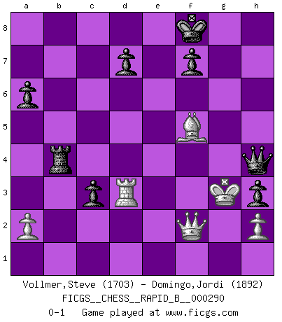 Last move : 0-1 2018 September 20 23:38:52 [Event "FICGS__CHESS__RAPID_B__000290"] [Site "FICGS"] [Date "2018.08.02"] [Round "1"] [White "Vollmer,Steve"] [Black "Domingo,Jordi"] [Result "0-1"] [WhiteElo "1703"] [BlackElo "1892"] 1.d4 h6 2.e4 c5 3.Nf3 g5 4.Bc4 cxd4 5.Qxd4 Nf6 6.Nc3 Bg7 7.O-O Nc6 8.Qd3 a6 9.Be3 Ng4 10.Nd5 Nxe3 11.Nxe3 e6 12.c3 h5 13.Rad1 g4 14.Nd4 Ne5 15.Qe2 b5 16.Bb3 Bb7 17.Bc2 Qb6 18.Kh1 Rc8 19.f4 gxf3 20.gxf3 b4 21.Rg1 Bf6 22.Rg3 bxc3 23.b3 Qc5 24.Qg2 h4 25.Rg8+ Rxg8 26.Qxg8+ Ke7 27.Qg2 Ng6 28.b4 Qxb4 29.Ndf5+ exf5 30.Nxf5+ Kf8 31.Nd6 Rc7 32.Qf2 Be5 33.Nxb7 Rxb7 34.f4 Bxf4 35.e5 Qc4 36.Rd4 Qc6+ 37.Be4 Rb1+ 38.Kg2 h3+ 39.Kf3 Nxe5+ 40.Kxf4 Qf6+ 41.Bf5 Nd3+ 42.Rxd3 Rb4+ 43.Kg3 Qh4+ 0-1 Queen's pawn Kingside Castling by player White (move 7) Player Black won this chess game. Follow this game move after move (download)Chess is like life. (Boris Spassky) Wie, soll nun auch die Opposition abgeschafft werden? Ja, es tut mir leid, Ihnen diesen Schmerz nicht ersparen zu können. (Aaron Nimzowitsch) El Ajedrez es un cuento de Hadas de las 1001 metidas de pata. (Savielly Tartakower) Nous sommes les pions de la mystérieuse partie d'Echecs jouée par Dieu. Il nous déplace, nous arrête, nous pousse encore, puis nous lance un à un dans la boîte du Néant. Epitaphe sur la tombe de David Janowsky (1868-1927). Mandala - that's it! 16x16 squares as multiple of the four and the eight because of the Four Noble Truths and the Noble Eightfold Path. (Heinz-Georg Lehnhoff about Big Chess)