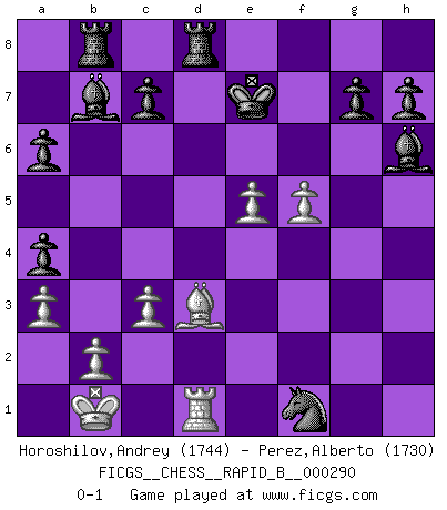 Last move : 0-1 2018 August 14 19:31:44 [Event "FICGS__CHESS__RAPID_B__000290"] [Site "FICGS"] [Date "2018.08.02"] [Round "1"] [White "Horoshilov,Andrey"] [Black "Perez,Alberto"] [Result "0-1"] [WhiteElo "1744"] [BlackElo "1730"] 1.e4 e5 2.Nf3 Nc6 3.Nc3 a6 4.a3 Bc5 5.Na4 Ba7 6.d3 d6 7.c3 b5 8.d4 bxa4 9.dxe5 Nxe5 10.Nxe5 dxe5 11.Qxd8+ Kxd8 12.Bg5+ f6 13.O-O-O Ke8 14.f3 fxg5 15.h4 Nf6 16.hxg5 Be3 17.Kc2 Bxg5 18.Bc4 Ke7 19.g3 Bb7 20.Rhf1 Rhd8 21.Bd3 Rab8 22.f4 exf4 23.gxf4 Bh6 24.e5 Ng4 25.f5 Ne3 26.Kb1 Nxf1 0-1 Three knights game Queenside Castling by player White (move 13) Player Black won this chess game. Follow this game move after move (download)A strong memory, concentration, imagination, and a strong will is required to become a great Chess player. (Bobby Fischer) Je mehr wir mit Computern analysieren, desto mehr glauben wir an Verteidigung. (Vladimir Kramnik) Un entendimiento minucioso de las típicas continuaciones de mate hacen de las mas complicadas combinaciones de sacrificio que conducen hacia ellas no solo no dificiles, sino casi un asunto de rutina. (Siegbert Tarrasch) Soyez une menace à chaque fois que vous vous asseyez pour jouer. (Ken Smith) Memory is a crazy woman that hoards colored rags and throws away food. (Austin O'Malley)