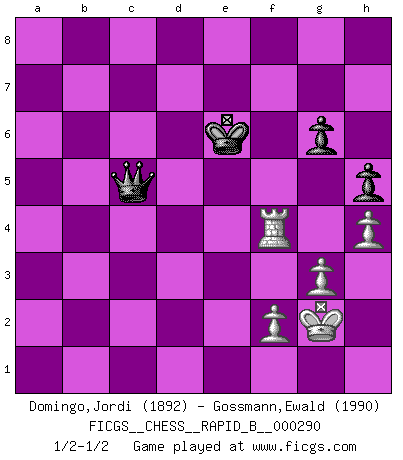 Last move : 1/2-1/2 2019 January 4 10:30:13 [Event "FICGS__CHESS__RAPID_B__000290"] [Site "FICGS"] [Date "2018.08.02"] [Round "1"] [White "Domingo,Jordi"] [Black "Gossmann,Ewald"] [Result "1/2-1/2"] [WhiteElo "1892"] [BlackElo "1990"] 1.e4 c6 2.d4 d5 3.e5 c5 4.c4 cxd4 5.Nf3 Nc6 6.Nxd4 e6 7.Nc3 Bb4 8.Nxc6 bxc6 9.Qa4 Rb8 10.cxd5 exd5 11.Qxc6+ Kf8 12.a3 Ne7 13.Qa4 Ba5 14.b4 Qc7 15.Ne2 Bb6 16.Bb2 d4 17.Qd1 Ba6 18.Rc1 Qb7 19.Ng3 d3 20.Qf3 Rd8 21.Bc3 Qd7 22.Ne4 Ng6 23.Rd1 h5 24.h4 Rh6 25.Rh3 Qc7 26.Bxd3 Rxd3 27.Rxd3 Nxe5 28.Bxe5 Qxe5 29.Kd2 Bxd3 30.Kxd3 Qd5+ 31.Kc2 Qc4+ 32.Nc3 Rc6 33.Qd3 Qa2+ 34.Kd1 Qxa3 35.Rf3 Qa1+ 36.Kc2 Qa2+ 37.Kd1 Qb3+ 38.Ke1 Qxb4 39.Qd5 Qe7+ 40.Kf1 Rc5 41.Qb3 Qb7 42.Qe6 a5 43.Kg1 Qc7 44.Qb3 a4 45.Qa3 Kg8 46.g3 Qc6 47.Nxa4 Rc1+ 48.Kg2 Qc4 49.Kh2 Qf1 50.Qxc1 Qxc1 51.Nxb6 Qc6 52.Rb3 f5 53.Rb4 Qc5 54.Rf4 Qxb6 55.Rxf5 g6 56.Rf4 Qd6 57.Kg1 Kg7 58.Kg2 Kh6 59.Kg1 Qd2 60.Kg2 Qd5+ 61.Kh2 Qd6 62.Kg1 Kg7 63.Kg2 Qd1 64.Rb4 Qd5+ 65.Kg1 Kf6 66.Rf4+ Ke5 67.Rb4 Qe6 68.Kg2 Qc6+ 69.Kg1 Qc1+ 70.Kg2 Qc5 71.Rf4 Qa3 72.Kg1 Qc1+ 73.Kg2 Qd2 74.Rf8 Ke6 75.Rf4 Ke5 76.Rf8 Qd6 77.Rf4 Qd5+ 78.Kg1 Qc6 79.Rb4 Qe8 80.Rf4 Kd5 81.Kg2 Qe5 82.Kg1 Qb2 83.Kg2 Qe5 84.Kg1 Ke6 85.Kg2 Qc5 1/2-1/2 Caro-Kann : Advance variation 10 pieces endgame at move 54 : White KRPPP , Black KQPPP WHITE : King + 1 Rook 3 Pawns BLACK : King + 1 Queen 3 Pawns 9 pieces endgame at move 55 : White KRPPP , Black KQPP WHITE : King + 1 Rook 3 Pawns BLACK : King + 1 Queen 2 Pawns This chess game ended in a draw. Follow this game move after move (download)What is the difference between chess and football? Everybody understands football, but nobody plays it. Everybody plays chess, but nobody understands it. Everything is relative. (Vladimir Kramnik) Der Freibauer hat für mich eine Seele, genau wie der Mensch, Wünsche, die unerkannt in ihm schlummern, und Befürchtungen, von deren Existenz er selbst kaum ahnt. (Aaron Nimzowitsch) Los Peones son el alma de una partida de Ajedrez. (Francois Andre Danican Philidor) Une platitude souvent récitée à propos des Echecs est qu'une des choses les plus difficiles à réaliser est de gagner une position gagnante. Cela ne manque pas de sens mais, pour ma part, j'ai toujours trouvé plus difficile de gagner une position perdante. (Tim Krabbe) Fear is the path to the dark side. Fear leads to anger; anger leads to hate; hate leads to suffering. I sense much fear in you. (Master Yoda in Star Wars ep.1)