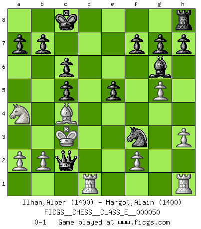 Last move : 0-1 2007 July 17 11:18:27 [Event "FICGS__CHESS__CLASS_E__000050"] [Site "FICGS"] [Date "2007.05.16"] [Round "1"] [White "Ilhan,Alper"] [Black "Margot,Alain"] [Result "0-1"] [WhiteElo "1400"] [BlackElo "1400"] 1.e4 e5 2.Nf3 Nc6 3.Nc3 Bc5 4.d3 d6 5.Be3 Bg4 6.Be2 Nf6 7.Bxc5 dxc5 8.h3 Bh5 9.g4 Bg6 10.Nh4 Nxe4 11.dxe4 Qxh4 12.g5 Nd4 13.Bb5+ c6 14.Bc4 O-O-O 15.Na4 Qxe4+ 16.Kd2 Nf3+ 17.Kc3 Rxd1 18.Raxd1 Qxc2+ 0-1 Comment by player 2 : Alain Margot : Hello Alper, Is there a problem ? regards, Alain Three knights game Queenside Castling by player Black (move 14) Player Black won this chess game. Follow this game move after move (download)I have added these principles to the law: get the Knights into action before both Bishops are developed. (Emanuel Lasker) Die Leute spielen gegen mich seit 15 Jahren unter Ihren Möglichkeiten. (Robert James Fischer) Fischer es una tragedia del Ajedrez Americano a la par con Morphy y Pillsbury. (Mig Greengard) Que feriez-vous si vous étiez en train de jouer aux échecs et que la fin du monde arrive ? Je continuerais à jouer. (Saint Borromée) For peace of mind, resign as general manager of the universe. (Douglas Adams)