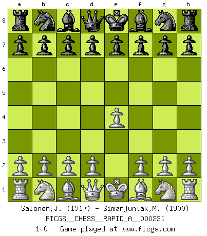 Last move : 1-0 2018 September 1 11:24:17 [Event "FICGS__CHESS__RAPID_A__000221"] [Site "FICGS"] [Date "2018.08.02"] [Round "1"] [White "Salonen,Jukka"] [Black "Simanjuntak,Marthin L."] [Result "1-0"] [WhiteElo "1917"] [BlackElo "1900"] 1.e4 1-0 This chess game has been lost on time (started : 2018.08.02 6:16:2) King's pawn Opening Player White won this chess game. Follow this game move after move (download)We cannot resist the fascination of sacrifice, since a passion for sacrifices is part of a Chessplayer's nature. (Rudolf Spielman) Wer nie einen Fehler gemacht hat, hat nie etwas Neues ausprobiert. (Albert Einstein) El Ajedrez es un juego de pelea el cual es puramente intelectual e incluye la suerte. (Richard Reti) Les échecs sont un jeu par leur forme, un art par leur essence et une science par sa difficulté d'acquisition. Ils peuvent vous procurer autant de plaisir qu'un bon livre ou une belle musique, mais vous n'aurez une réelle joie que si vous arrivez à bien jouer. (Tigran Petrosian) Wisdom begins at the end. (Daniel Webster)