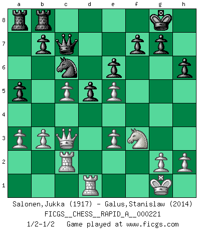 Last move : 1/2-1/2 2018 September 2 8:53:31 [Event "FICGS__CHESS__RAPID_A__000221"] [Site "FICGS"] [Date "2018.08.02"] [Round "1"] [White "Salonen,Jukka"] [Black "Galus,Stanislaw"] [Result "1/2-1/2"] [WhiteElo "1917"] [BlackElo "2014"] 1.e4 e6 2.d4 d5 3.e5 c5 4.c3 Nc6 5.Nf3 Bd7 6.Be2 Nge7 7.O-O cxd4 8.cxd4 Nf5 9.Nc3 Rc8 10.Bg5 Qb6 11.Na4 Qa5 12.Rc1 h6 13.Bd2 Qd8 14.Be3 Nxe3 15.fxe3 Na5 16.Nc5 Bxc5 17.dxc5 Nc6 18.Qd3 Qc7 19.Qc3 a5 20.b3 Ra8 21.a3 O-O 22.Qb2 Rfb8 23.Rc2 Be8 24.Rfc1 Na7 25.Ra1 Qe7 26.Rf1 Bb5 27.Bxb5 Nxb5 28.Nd4 Na7 29.Qc3 Qc7 30.Nf3 Nc6 31.Rd1 1/2-1/2 French : Advance, Euwe variation Kingside Castling by player White (move 7) Kingside Castling by player Black (move 21) This chess game ended in a draw. Follow this game move after move (download)The battle for the ultimate truth will never be won. And that's why Chess is so fascinating. (Hans Kmoch) Bobby Fischer ist kein Vorbild für die heutige Jugend. (Viktor Kortschnoi) Fischer es una tragedia del Ajedrez Americano a la par con Morphy y Pillsbury. (Mig Greengard) Si rien de grave n'est détecté lors de l'analyse d'une position, on joue alors le coup. Seconde règle de Blumenfeld. We cannot be sure of having something to live for unless we are willing to die for it. (Ernesto Che Guevara)