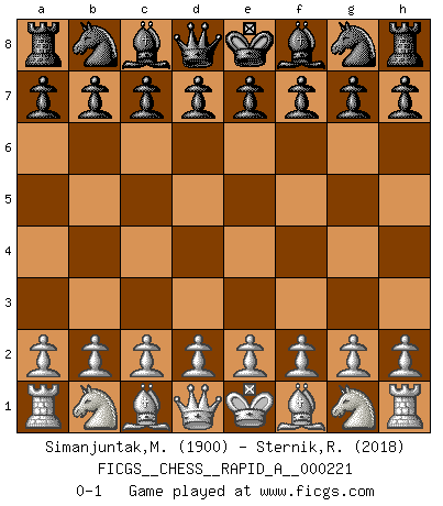 Last move : 0-1 2018 September 1 11:24:17 [Event "FICGS__CHESS__RAPID_A__000221"] [Site "FICGS"] [Date "2018.08.02"] [Round "1"] [White "Simanjuntak,Marthin L."] [Black "Sternik,Ryszard"] [Result "0-1"] [WhiteElo "1900"] [BlackElo "2018"] 0-1 This chess game has been lost on time (started : 2018.08.02 6:16:2) Player Black won this chess game. Follow this game move after move (download)I guess a certain amount of temperament is expected of Chess geniuses. (Ron Gross) Gewöhnliche Menschen denken nur daran, wie sie ihre Zeit verbringen. Ein intelligenter Mensch versucht, sie auszunutzen. (Arthur Schopenhauer) Siempre es mejor sacrificar los hombres de tu oponente. (Savielly Tartakower) Je menace de comprendre la position. (Anonyme) Better than a thousand days of diligent study is one day with a great teacher. (Japanese proverb)