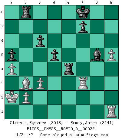Last move : 1/2-1/2 2018 September 7 19:58:12 [Event "FICGS__CHESS__RAPID_A__000221"] [Site "FICGS"] [Date "2018.08.02"] [Round "1"] [White "Sternik,Ryszard"] [Black "Romig,James"] [Result "1/2-1/2"] [WhiteElo "2018"] [BlackElo "2141"] 1.e4 c5 2.Nf3 d6 3.d4 cxd4 4.Nxd4 Nf6 5.Nc3 a6 6.Bg5 Qb6 7.Bxf6 gxf6 8.Nd5 Qa5+ 9.c3 Nc6 10.Qh5 Qd8 11.Bc4 e6 12.Nxc6 bxc6 13.Nf4 Qe7 14.O-O-O Rg8 15.Qxh7 Rg7 16.Qh8 Bd7 17.Qh4 e5 18.Nh5 Rg6 19.f4 Bg4 20.Rde1 Bh6 21.h3 Bxh5 22.Qxh5 exf4 23.Kb1 Kf8 24.Re2 Qe5 25.Qh4 f3 26.gxf3 Qg3 27.Qxg3 Rxg3 28.Rf2 a5 29.a4 Be3 30.R2f1 Rb8 31.Ka2 Rg2 32.Rb1 f5 33.h4 fxe4 34.fxe4 Rg4 35.Bb3 Rxe4 36.Rbf1 d5 37.Rf6 Rc8 38.h5 Bg5 39.Rf3 Rb8 1/2-1/2 Sicilian : Najdorf, 6.Bg5 Queenside Castling by player White (move 14) This chess game ended in a draw. Follow this game move after move (download)A Chess game is a dialogue, a conversation between a player and his opponent. Each move by the opponent may contain threats or be a blunder, but a player cannot defend against threats or take advantage of blunders if he does not first ask himself: What is my opponent planning after each move ? (Bruce A. Moon) Privat ist Kortschnoi kein schlechter Mensch, sehr sympathisch. Aber während des Spiels ist er grausam. Er will dich töten. (Miguel Najdorf) El tablero es el mundo, las piezas es el fenomeno del universo, las reglas del juego son lo que llamamos leyes de la naturaleza y el jugador del lado opuesto, se encuentra oculto a nuestra vista. (Thomas Huxley) Les échecs sont un jeu terrible. Si vous n'avez pas le centre, votre adversaire a une position plus libre. Par contre, si vous avez le centre, alors vous avez vraiment quelque chose pour laquelle vous inquiéter ! (Siegbert Tarrasch) God is an atheist. (Unknown)