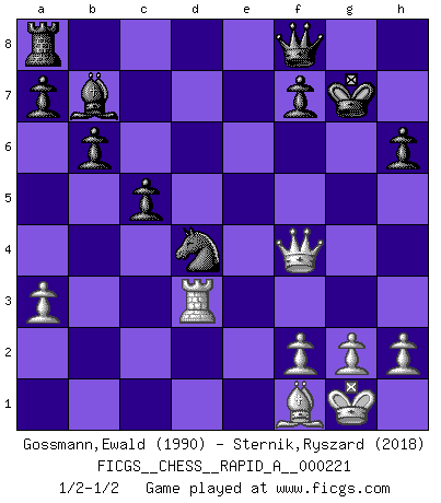 Last move : 1/2-1/2 2018 August 29 18:7:18 [Event "FICGS__CHESS__RAPID_A__000221"] [Site "FICGS"] [Date "2018.08.02"] [Round "1"] [White "Gossmann,Ewald"] [Black "Sternik,Ryszard"] [Result "1/2-1/2"] [WhiteElo "1990"] [BlackElo "2018"] 1.d4 Nf6 2.c4 e6 3.Nc3 d5 4.Nf3 c6 5.e3 Nbd7 6.Qc2 Bd6 7.b3 O-O 8.Be2 b6 9.O-O Bb7 10.Bb2 Qe7 11.Rad1 Rfd8 12.e4 Nxe4 13.Nxe4 dxe4 14.Qxe4 Nf6 15.Qc2 c5 16.d5 exd5 17.cxd5 Nxd5 18.Rfe1 Nb4 19.Qc1 Qf8 20.a3 Nc6 21.Bc4 Be7 22.Ng5 Bxg5 23.Qxg5 h6 24.Qf4 Na5 25.Bf1 Rxd1 26.Rxd1 Nxb3 27.Bxg7 Kxg7 28.Rd3 Nd4 1/2-1/2 Queen's pawn game Kingside Castling by player Black (move 7) Kingside Castling by player White (move 9) This chess game ended in a draw. Follow this game move after move (download)Chess is played with the mind and not with the hands ! (Renaud and Kahn) Ich verstehe Aljechins Kombinationen ganz gut; aber woher er diese Angriffschancen bekommt und wie er die Eröffnung behandelt das ist für mich ein Buch mit sieben Siegeln. (Rudolf Spielmann) El jugador blanco perdió porque fallo en recordar la coreccta continuación y tuvo que pensar por sí mismo las movidas. (Siegbert Tarrasch) Les écrivains ont utilisé les échecs pour analyser les côtés extrêmes de la nature humaine. Dans ce cadre, les échecs offrent un champ d'expérimentation idéal. Mais on pourrait faire la même chose avec la peinture. Et là, en vous référant à Van Gogh, vous ne tirerez pas de conclusion définitive sur les peintres. (Gary Kasparov) You cannot beat a roulette table unless you steal money from it. (Albert Einstein)