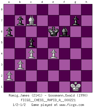 Last move : 1/2-1/2 2018 August 5 19:35:54 [Event "FICGS__CHESS__RAPID_A__000221"] [Site "FICGS"] [Date "2018.08.02"] [Round "1"] [White "Romig,James"] [Black "Gossmann,Ewald"] [Result "1/2-1/2"] [WhiteElo "2141"] [BlackElo "1990"] 1.e4 e5 2.Nf3 Nc6 3.Bb5 Nf6 4.O-O Nxe4 5.d4 Nd6 6.Bxc6 dxc6 7.dxe5 Nf5 8.Qxd8+ Kxd8 9.Nc3 Ke8 10.Rd1 Be7 11.b3 Nh4 12.Nxh4 Bxh4 13.Ne2 h5 14.Bb2 Bf5 15.c4 Rd8 16.Rd4 Be7 17.Rad1 Rxd4 18.Nxd4 Bh7 19.Bc3 Rg8 20.h3 a6 21.g4 hxg4 22.hxg4 c5 23.Nf5 Bxf5 24.gxf5 Rh8 25.Re1 Kd7 26.e6+ fxe6 27.fxe6+ Ke8 28.Bd2 Rh5 29.Re4 Bf6 30.Bf4 Rh4 31.f3 Ke7 32.Bxc7 Rxe4 33.fxe4 Kxe6 1/2-1/2 Ruy Lopez : Berlin defense, Open variation Kingside Castling by player White (move 4) This chess game ended in a draw. Follow this game move after move (download)The combination player thinks forward; he starts from the given position, and tries the forceful moves in his mind. (Emanuel Lasker) In der Schule lernt man nichts. Es ist nur Zeitverschwendung. (Robert James Fischer) Los libros de Ajedrez deben de usarse igual como usamos los anteojos: para mejorar la vista, aunque algunos jugadores los quieren usar como si ellos les otorgaran la vision. (José Raúl Capablanca) Les échecs sont utiles à l'exercice de la faculté de penser et à celle de l'imagination. Car nous devons posséder une méthode élaborée pour atteindre des buts partout où nous devons conduire notre raison. (Leibnitz) Gambling : The sure way of getting nothing from something. (Wilson Mizner)