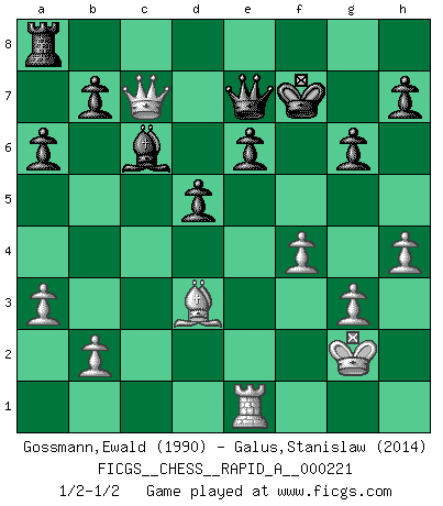 Last move : 1/2-1/2 2018 August 24 17:31:39 [Event "FICGS__CHESS__RAPID_A__000221"] [Site "FICGS"] [Date "2018.08.02"] [Round "1"] [White "Gossmann,Ewald"] [Black "Galus,Stanislaw"] [Result "1/2-1/2"] [WhiteElo "1990"] [BlackElo "2014"] 1.e4 e6 2.d4 d5 3.Nd2 Nf6 4.e5 Nfd7 5.Bd3 c5 6.c3 Nc6 7.Ngf3 Qb6 8.O-O cxd4 9.cxd4 Nxd4 10.Nxd4 Qxd4 11.Nf3 Qb6 12.a3 Be7 13.Be3 Bc5 14.Bd2 O-O 15.Qc2 f5 16.exf6 Nxf6 17.Rac1 Bd6 18.Bc3 Bd7 19.Qe2 Rfe8 20.Bd4 Qd8 21.Ne5 a6 22.g3 Re7 23.Kg2 Qe8 24.Bc5 Bxc5 25.Rxc5 Qd8 26.Rfc1 Ba4 27.f4 Nd7 28.Nxd7 Qxd7 29.Rc7 Qd8 30.Rxe7 Qxe7 31.Qh5 g6 32.Qe5 Bc6 33.h4 Kf7 34.Re1 Qf6 35.Qc7+ Qe7 36.Qe5 Qf6 37.Qc7+ Qe7 1/2-1/2 French : Tarrasch, Closed variation Kingside Castling by player White (move 8) Kingside Castling by player Black (move 14) This chess game ended in a draw. Follow this game move after move (download)Strategy requires thought, tactics require observation. (Max Euwe) Es liegt in der Natur, vernüftig zu denken und unlogisch zu handeln. (Anatole France) El Ajedrez es un invernadero donde los frutos del carácter pueden madurar mas completamente que en la vida. (Edward Morgan Foster) Dieu déplace le joueur, et celui-ci la pièce. Quel Dieu derrière Dieu commence donc la trame ? Arturo Perez-Reverte (prix de littérature policière 1993). A bird doesn't sing because it has an answer, it sings because it has a song. (Maya Angelou)