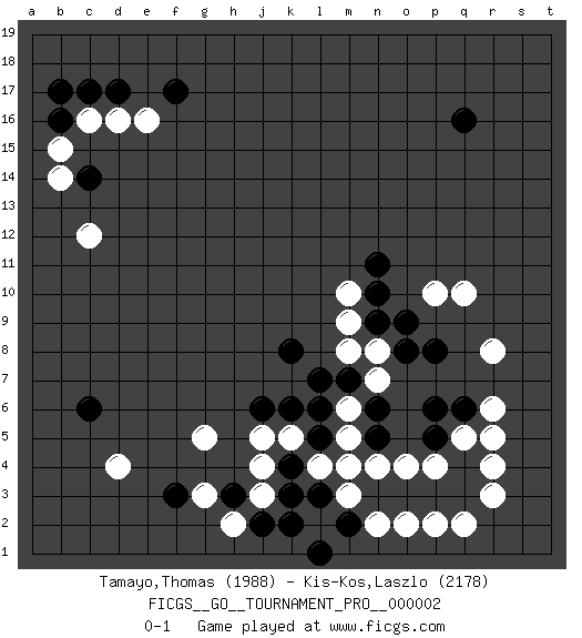 Last move : 0-1 2007 June 29 16:49:4 [Event "FICGS__GO__TOURNAMENT_PRO__000002"] [Site "FICGS"] [Date "2007.05.16"] [Round "1"] [Black "Tamayo,Thomas"] [White "Kis-Kos,Laszlo"] [Result "0-1"] [Rating 1 "1988"] [Rating 2 "2178"] 1.q16 d4 2.q3 d16 3.k4 r6 4.c14 c12 5.c17 c16 6.d17 e16 7.b16 b15 8.b17 b14 9.f17 r3 10.q4 r4 11.q6 q5 12.p5 r5 13.p6 p4 14.p3 o4 15.o3 n4 16.n3 m4 17.l3 n7 18.p8 r8 19.n6 m6 20.n5 m5 21.o8 q10 22.m7 n8 23.n9 m8 24.l7 k5 25.k8 m9 26.n10 m10 27.n11 p10 28.o9 j5 29.k6 m3 30.m2 l2 31.k2 n2 32.l1 o2 33.l5 q2 34.j6 l4 35.l6 p2 36.c6 j4 37.k3 g5 38.f3 h2 39.h3 j3 40.j2 g3 0-1 Here are the names of the openings (joseki) played in the four corners : Corner q4 : q3 r6 Komoku (Somok, Xiao~mu`) 3-4 Point. The komoku (3-4) point is the traditional corner enclosure move.. Nikken Kakari (Dukan Keolch'im, E`r Gua`jiao~, 2-Space Low Approach). White 2 is used with friendly forces backing it up. Its purpose is to prevent a pincer. Locally it results in a loss, but may be appropriate fuseki strategy. It was popular in the late 1950s and early 1960s, but is not seen often nowadays, having been replaced by the one-space high approach, with which it has points in common. Corner d16 : d16 c14 Hoshi (Hwajeom, Seongjeom, Xingwei`) 4-4 Point. The star or hoshi (4-4) point, emphasizing influence at the potential expense of territory. Ikken Kakari (Hankan Keolch'im, Yi Gua`jiao~, 1-Space Low Approach). Black 2 is the standard approach move to the 4-4. Player White won this Go (weiqi, baduk) game. Follow this game move after move (download)In an unreasonable situation, an unreasonable move is reasonable. (Tamino) I take risks, sometimes patients die, but not taking risks causes more patients to die. So I guess my biggest problem is I've been cursed with the ability to do the math. (Gregory House, House M.D.)