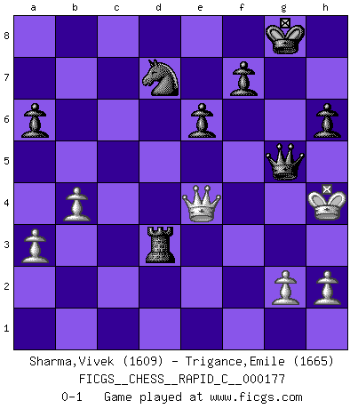 Last move : 0-1 2018 August 6 19:24:37 [Event "FICGS__CHESS__RAPID_C__000177"] [Site "FICGS"] [Date "2018.08.03"] [Round "1"] [White "Sharma,Vivek"] [Black "Trigance,Emile"] [Result "0-1"] [WhiteElo "1609"] [BlackElo "1665"] 1.e4 c6 2.f4 d5 3.e5 Bf5 4.Nf3 h6 5.d4 e6 6.Be3 Nd7 7.Be2 Qb6 8.Qc1 c5 9.O-O cxd4 10.Nxd4 Bc5 11.Rd1 Ne7 12.Nc3 Bxd4 13.Bxd4 Qa5 14.Nb5 Nc8 15.a3 a6 16.b4 Qd8 17.Nd6+ Nxd6 18.exd6 Rc8 19.c3 Nf6 20.Be5 O-O 21.c4 dxc4 22.Bxc4 b5 23.Rd4 bxc4 24.Rxc4 Qb6+ 25.Rc5 Nd7 26.Rb1 Bxb1 27.Qxb1 Rxc5 28.Bd4 Rfc8 29.Bxc5 Rxc5 30.Kf1 Qb5+ 31.Kf2 Rc6 32.Kg3 Rxd6 33.Qe4 Rd3+ 34.Kh4 g5+ 35.fxg5 Qxg5+ 0-1 Caro-Kann defense Kingside Castling by player White (move 9) Kingside Castling by player Black (move 20) Player Black won this chess game. Follow this game move after move (download)Chess is everything: art, science and sport. (Anatoly Karpov) Die Leute spielen gegen mich seit 15 Jahren unter Ihren Möglichkeiten. (Robert James Fischer) Fischer es el jugador mas fuerte del mundo. De hecho, el jugador mas fuerte que jamas haya existido. (Larry Evans) J'ai toujours senti une vague pitié pour l'homme qui ne connaît rien aux échecs, tout comme j'en aurais pour un homme ignorant de l'amour. Les Echecs, comme la musique ou comme l'amour, ont le pouvoir de rendre heureux. (Siegbert Tarrasch) Live, lose, and learn, by observing your opponent how to win. (Amber Steenbock)