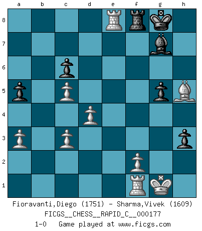 Last move : 1-0 2018 November 20 11:5:53 [Event "FICGS__CHESS__RAPID_C__000177"] [Site "FICGS"] [Date "2018.08.03"] [Round "1"] [White "Fioravanti,Diego"] [Black "Sharma,Vivek"] [Result "1-0"] [WhiteElo "1751"] [BlackElo "1609"] 1.c3 Nf6 2.d4 g6 3.Nf3 Bg7 4.Bf4 O-O 5.Nbd2 d5 6.e3 Bf5 7.Be2 Ng4 8.h3 Nf6 9.O-O Nc6 10.a3 Nh5 11.Bh2 Re8 12.g4 Bxg4 13.hxg4 Nf6 14.Ne5 Ne4 15.Nxc6 bxc6 16.Bf3 e5 17.Nxe4 dxe4 18.Bg2 exd4 19.exd4 Rb8 20.Rb1 Re6 21.Qe2 Qe7 22.b4 Re8 23.Qe3 Qh4 24.Qg3 g5 25.Qxh4 gxh4 26.Bf4 Rg6 27.Bh3 h5 28.g5 f6 29.Bf5 Rxg5+ 30.Bxg5 fxg5 31.Rbe1 a5 32.Rxe4 Rf8 33.Bg6 c5 34.bxc5 c6 35.Re8 h3 36.Bxh5 1-0 This chess game has been lost on time (started : 2018.08.03 16:48:4) Saragossa Opening Kingside Castling by player Black (move 4) Kingside Castling by player White (move 9) Player White won this chess game. Follow this game move after move (download)Chess is as much a mystery as women. (Purdy) Eine Person mit durchschnittlichem IQ kann etwa eine ELO von 2000 erreichen. (Jonathan Levitt) En el Ajedrez, tal como es jugado por los Maestros, practicamente la suerte es eliminada. (Emanuel Lasker) Toute estimation doit être constamment réévaluée. (Jacob Estrin) There are two types of people in this world, good and bad. The good sleep better, but the bad seem to enjoy the waking hours much more. (Woody Allen)