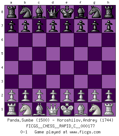 Last move : 0-1 2018 September 2 23:38:37 [Event "FICGS__CHESS__RAPID_C__000177"] [Site "FICGS"] [Date "2018.08.03"] [Round "1"] [White "Panda,Sumbe"] [Black "Horoshilov,Andrey"] [Result "0-1"] [WhiteElo "1500"] [BlackElo "1744"] 0-1 This chess game has been lost on time (started : 2018.08.03 16:48:4) Player Black won this chess game. Follow this game move after move (download)Why must I lose to this idiot ? (Aron Nimzovich) Der Freibauer hat für mich eine Seele, genau wie der Mensch, Wünsche, die unerkannt in ihm schlummern, und Befürchtungen, von deren Existenz er selbst kaum ahnt. (Aaron Nimzowitsch) El jugador táctico sabe que hacer cuando hay algo que hacer; mientras que el estratega sabe que hacer cuando no hay nada que hacer. (Gerald Abrahams) Mais l'homme est une créature légère et illogique : semblable au joueur d'échecs, il n'aime que le processus du but à atteindre, non le but lui-même. (Dostoïevsky) It is not titles that honor men, but men that honor titles. (Niccolo Machiavelli)