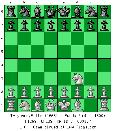 Last move : 1-0 2018 September 2 23:38:37 [Event "FICGS__CHESS__RAPID_C__000177"] [Site "FICGS"] [Date "2018.08.03"] [Round "1"] [White "Trigance,Emile"] [Black "Panda,Sumbe"] [Result "1-0"] [WhiteElo "1665"] [BlackElo "1500"] 1.Nf3 1-0 This chess game has been lost on time (started : 2018.08.03 16:48:4) Reti Opening Player White won this chess game. Follow this game move after move (download)You have to have the fighting spirit. You have to force moves and take chances. (Bobby Fischer) Intelligenz läßt sich nicht am Weg, sondern nur am Ergebnis feststellen. (Garry Kasparov) Si tu oponente te ofrece un empate, trata de averiguar porque piensa él que esta en una posición peor. (Nigel Short) Si rien de grave n'est détecté lors de l'analyse d'une position, on joue alors le coup. Seconde règle de Blumenfeld. There's always a bigger fish. (Qui-Gon Jinn in Star Wars ep.1)