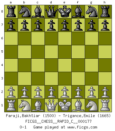 Last move : 0-1 2018 September 2 23:38:37 [Event "FICGS__CHESS__RAPID_C__000177"] [Site "FICGS"] [Date "2018.08.03"] [Round "1"] [White "Faraji,Bakhtiar"] [Black "Trigance,Emile"] [Result "0-1"] [WhiteElo "1500"] [BlackElo "1665"] 0-1 This chess game has been lost on time (started : 2018.08.03 16:48:4) Player Black won this chess game. Follow this game move after move (download)The tactician must know what to do whenever something needs doing; the strategist must know what to do when nothing needs doing. (Savielly Tartakover) Schach ist Leben. (Robert James Fischer) La única cosa que los jugadores de Ajedrez tienen en común, es el Ajedrez. (Lodewijk Prins) Plusieurs personnes se sont demandées comment Tal faisait pour gagner... En fait, c'est très simple ! Il met ses pièces au centre de l'échiquier et les sacrifie quelque part ! (David Bronstein) To err is human, but to really foul things up requires a computer. (Farmer's Almanac, 1978)
