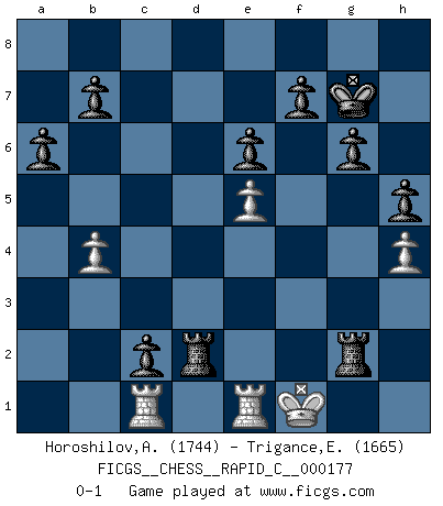 Last move : 0-1 2018 August 16 3:59:15 [Event "FICGS__CHESS__RAPID_C__000177"] [Site "FICGS"] [Date "2018.08.03"] [Round "1"] [White "Horoshilov,Andrey"] [Black "Trigance,Emile"] [Result "0-1"] [WhiteElo "1744"] [BlackElo "1665"] 1.e4 c6 2.Nf3 d5 3.exd5 cxd5 4.Bb5+ Bd7 5.Bxd7+ Nxd7 6.O-O Ngf6 7.d3 g6 8.Bf4 Nh5 9.Bd2 Bg7 10.Bc3 Nhf6 11.Re1 O-O 12.Qe2 Re8 13.Ne5 Nxe5 14.Bxe5 Qb6 15.c3 Nd7 16.Bxg7 Kxg7 17.d4 h5 18.b4 a6 19.Kh1 Qf6 20.Nd2 e6 21.Nf3 Rac8 22.Rac1 Rc4 23.Ne5 Nxe5 24.dxe5 Qg5 25.Qe3 Qxe3 26.Rxe3 Rec8 27.h3 d4 28.Rd3 dxc3 29.a3 c2 30.Kg1 Re4 31.Re3 Rd4 32.R3e1 Rc3 33.Kh2 Rd2 34.f3 Rxa3 35.h4 Rxf3 36.Kg1 Rg3 37.Kf1 R3xg2 0-1 Caro-Kann defense Kingside Castling by player White (move 6) Kingside Castling by player Black (move 11) Player Black won this chess game. Follow this game move after move (download)Bobby is the most misunderstood, misquoted celebrity walking the face of this earth. (Yasser Seirawan) Ohne Fehler kann es keine Brillanz geben. (Emanuel Lasker) Aunque la mayoría de la gente disfruta observar las partidas de los grandes Maestros de ataque, algunos de los jugadores mas notables en la historia han sido los jugadores silenciosos posicionales. Lentamente ellos te aplastan despojandote de tu espacio, congestionando tus piezas y dejandote virtualmente sin nada que hacer. (Yasser Seirawan) Avant la finale, les dieux ont créé le milieu de partie. (Tarrasch) A good book on your shelf is a friend that turns its back on you and remains a friend. (Author unknown)