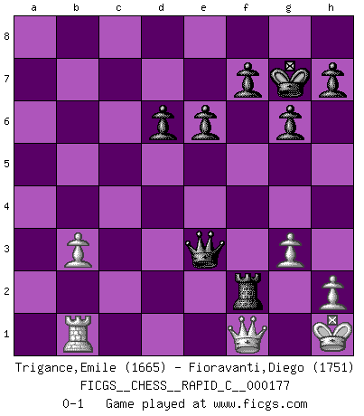 Last move : 0-1 2018 October 4 9:40:21 [Event "FICGS__CHESS__RAPID_C__000177"] [Site "FICGS"] [Date "2018.08.03"] [Round "1"] [White "Trigance,Emile"] [Black "Fioravanti,Diego"] [Result "0-1"] [WhiteElo "1665"] [BlackElo "1751"] 1.Nf3 c5 2.c4 g6 3.Nc3 Bg7 4.d4 cxd4 5.Nxd4 Nc6 6.Nc2 d6 7.g3 Nf6 8.Bg2 O-O 9.b3 Bd7 10.Bb2 a6 11.O-O Rb8 12.Rb1 b5 13.cxb5 axb5 14.e4 Ne5 15.Ne3 b4 16.Ncd5 Nxd5 17.Nxd5 Bb5 18.Re1 Ba6 19.Bf1 Bxf1 20.Rxf1 e6 21.Ne3 Ra8 22.Nc4 Rxa2 23.Kh1 Nxc4 24.Bxg7 Kxg7 25.Qd4+ Qf6 26.Qxc4 Rxf2 27.Rxf2 Qxf2 28.Qxb4 Rc8 29.Qe1 Qf3+ 30.Kg1 Rc2 31.Qf1 Qe3+ 32.Kh1 Qxe4+ 33.Kg1 Qe3+ 34.Kh1 Rf2 0-1 Reti Opening Kingside Castling by player Black (move 8) Kingside Castling by player White (move 11) Player Black won this chess game. Follow this game move after move (download)All Chess players should have a hobby. (Savielly Tartakower) Wie gewinnt Tal? Er entwickelt alle seine Figuren in die Brettmitte und opfert sie dann irgendwo. (Robert James Fischer) No es suficiente ser un buen jugador, se debe también de jugar bién. (Siegbert Tarrasch) Ne tendez aucun piège pour le plaisir ! Ne jouez rien dans l'espoir que l'adversaire réagisse de façon stupide ! Prenez toujours pour acquis que l'adversaire va trouver le meilleur coup ! Ne jouez jamais de coup dans l'espoir que l'adversaire ne voie pas la menace ! Chacun de vos coups doit améliorer la position d'une façon ou d'une autre. If you are going through hell, keep going. (Winston Churchill)