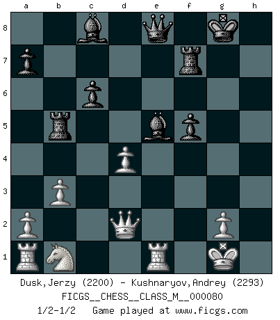 Last move : 1/2-1/2 2018 November 10 11:58:5 [Event "FICGS__CHESS__CLASS_M__000080"] [Site "FICGS"] [Date "2018.08.03"] [Round "1"] [White "Dusk,Jerzy"] [Black "Kushnaryov,Andrey"] [Result "1/2-1/2"] [WhiteElo "2200"] [BlackElo "2293"] 1.e4 c5 2.Nf3 Nc6 3.Bb5 g6 4.Bxc6 bxc6 5.O-O Bg7 6.Re1 Nh6 7.c3 O-O 8.h3 f5 9.e5 Nf7 10.d3 Rb8 11.b3 d6 12.Bf4 h6 13.h4 e6 14.Qd2 g5 15.hxg5 hxg5 16.Nxg5 dxe5 17.Nxf7 Rxf7 18.Bg5 Qe8 19.f4 exf4 20.Bxf4 e5 21.d4 cxd4 22.cxd4 Rb5 23.Bxe5 Bxe5 1/2-1/2 Sicilian : Nimzovich-Rossolimo attack (with ...g6, without ...d6) Kingside Castling by player White (move 5) Kingside Castling by player Black (move 7) This chess game ended in a draw. Follow this game move after move (download)A big shock; the best chess player in history has passed away. (Lajos Portisch, about Bobby Fischer's death) Ich organisiere ein großes Turnier, was mich etwa 120000 Dollar kostet. Ich denke, das ist das erste Mal in der Schachgeschichte, daß ein Schachgroßmeister auch als Mäzen auftritt. (Miguel Najdorf) EL Ajedrez es como la vida. (Boris Spassky) J'ai toujours senti une vague pitié pour l'homme qui ne connaît rien aux échecs, tout comme j'en aurais pour un homme ignorant de l'amour. Les Echecs, comme la musique ou comme l'amour, ont le pouvoir de rendre heureux. (Siegbert Tarrasch) Memory is a crazy woman that hoards colored rags and throws away food. (Austin O'Malley)